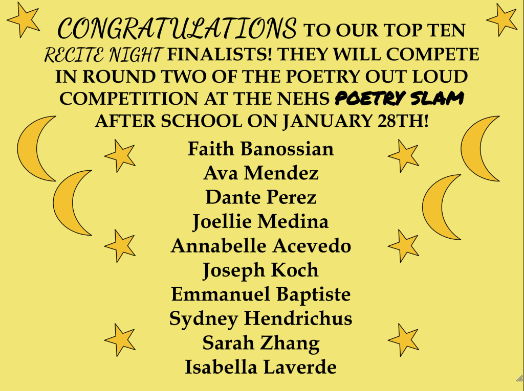 Congratulations to our top 10 Recite Night finalists, who will go on to compete in our upcoming Poetry Out Loud competition as a part of our Poetry Slam, which will be held in January!