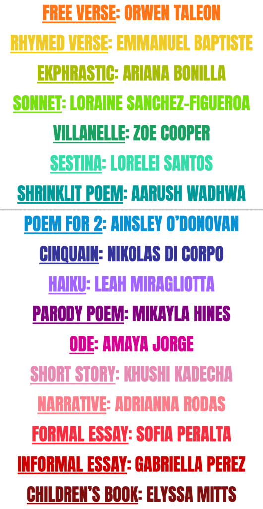 Senior Kiley Irizarry won two awards, earning 1st place in the sonnet category and 3rd place in the ode category!